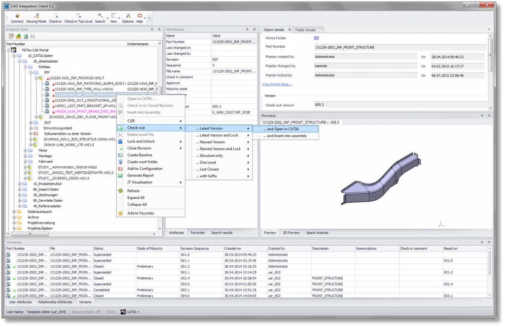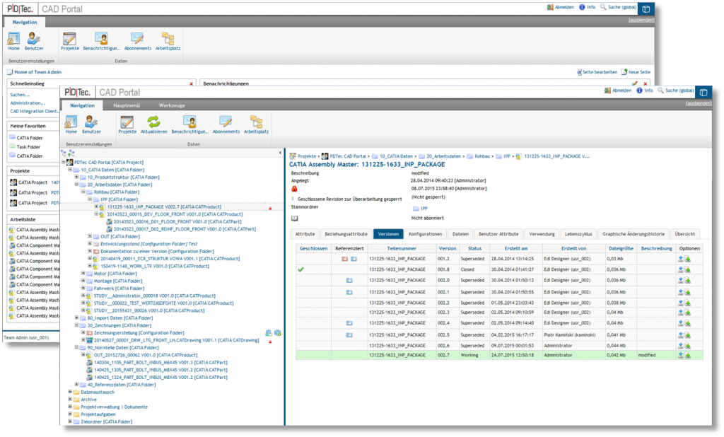 Zur internen Bearbeitung werden die vom Partner empfangenen, ggf. konfigurierten PDM-Strukturen in einheitliche CAD-Strukturen überführt. Dabei bleibt die Verknüpfung zwischen beiden Strukturen, d.h. auch zwischen den entsprechenden Versionsständen und Konfigurationen, erhalten. So ist eine Rückverfolgung der CAD-Stände zu den Originaldaten des Partners jederzeit möglich.